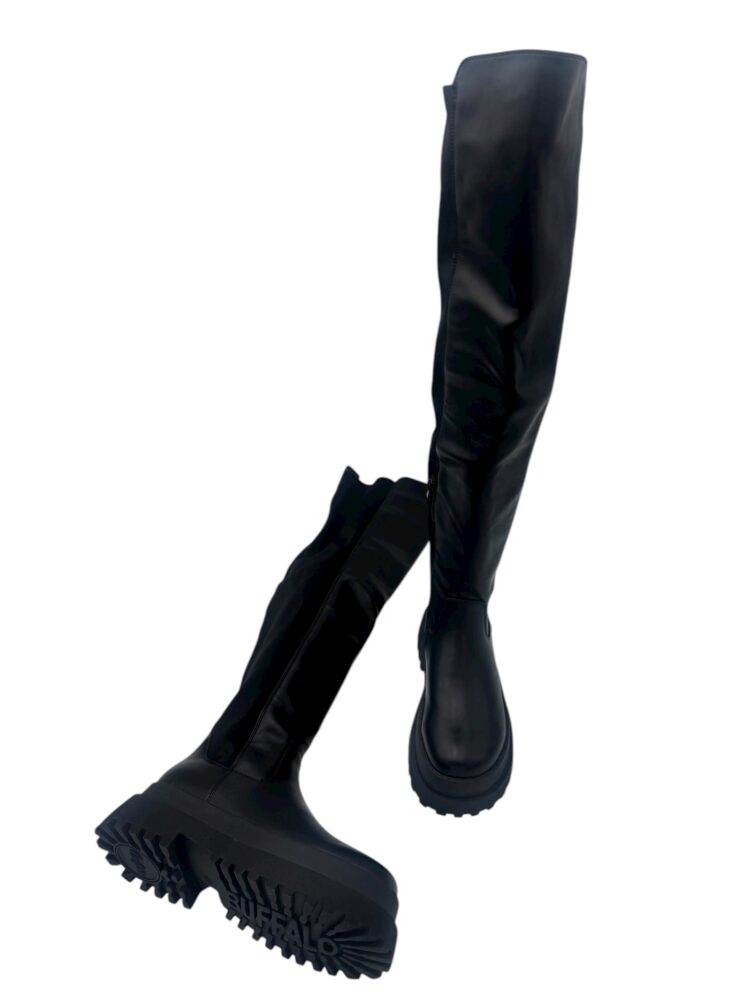 Buffalo: rouheat & rokkaavat paksupohjaiset mustat Pluto ylipolven saappaat.