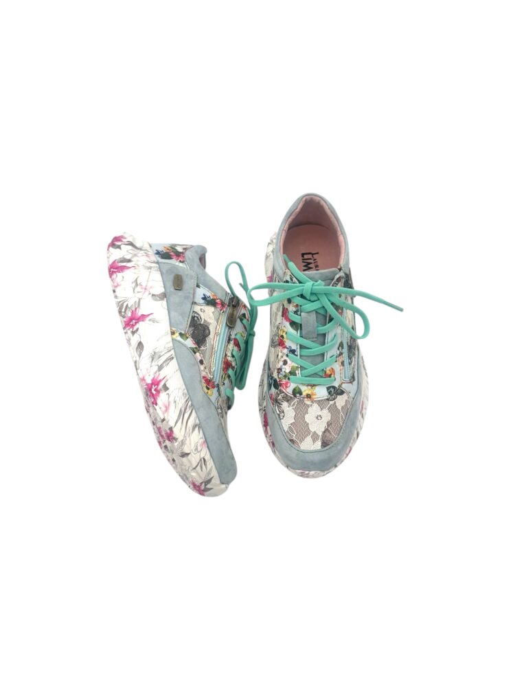 Laura Vitan uskomattoman upeat, persoonalliset ja naiselliset nahkaiset Sofia kukkatennarit. Yksityiskohtana kauniita kukkakuvioita sekä pitsiä. Kaunis pehmeä harmahtavan sininen sävymaailma ja turkoosin väriset nauhat. Sisäpuolelta myös nahkaa ja tilava, oikein mukava lesti. Lisäksi irroitettava nahkainen, vaimennettu sisäpohjallinen. Vetoketju ulkosyrjällä tuo ilmettä ja helpottaa pukemista.